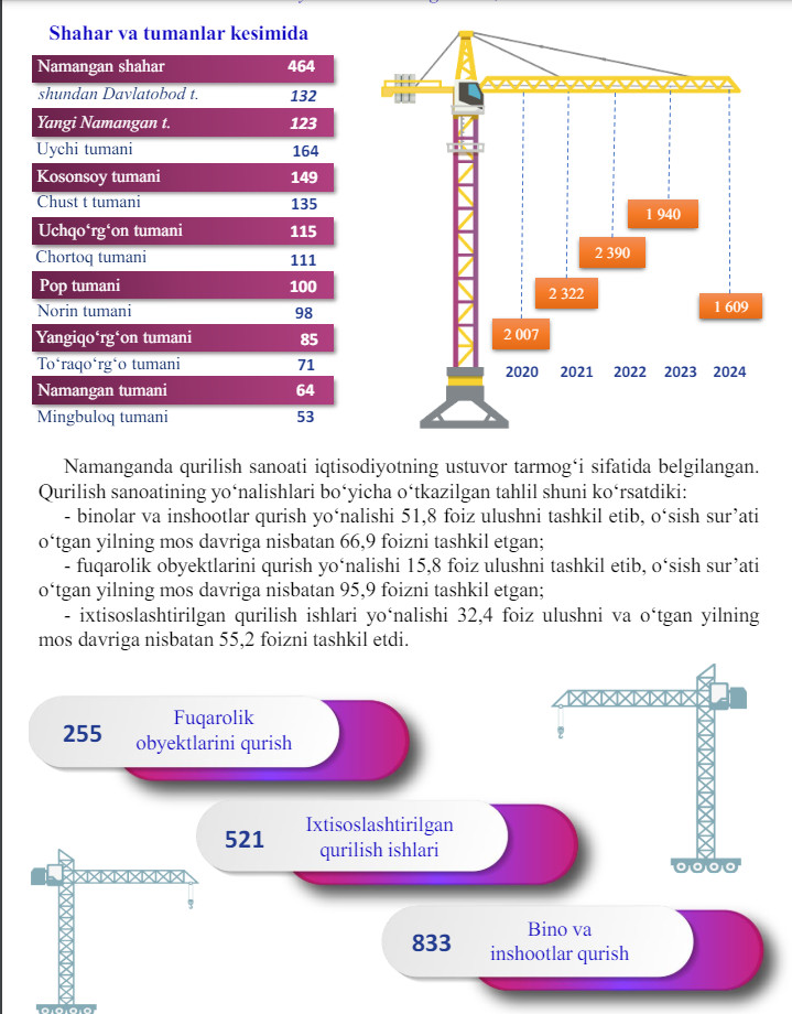 2024- yil 1- mart holatiga koʻra, Namangan viloyatida qurilish faoliyati bilan shugʻullanayotgan korxona va tashkilotlar toʻgʻrisida maʼlumotlar, birlikda