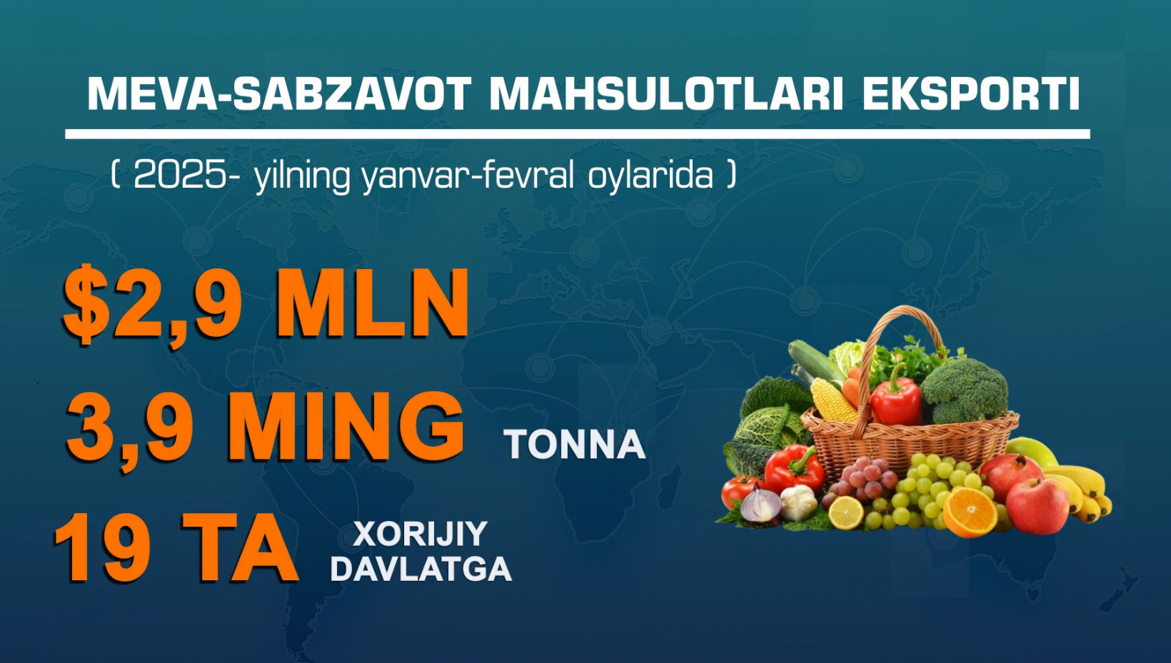 2025- yilning yanvar-fevral oylarida Namangan viloyati xorijiy davlatlarga qiymati 2,9 mln AQSH dollariga teng bo‘lgan jami 3,9 ming tonna meva va sabzavotlar eksportini amalga oshirgan.