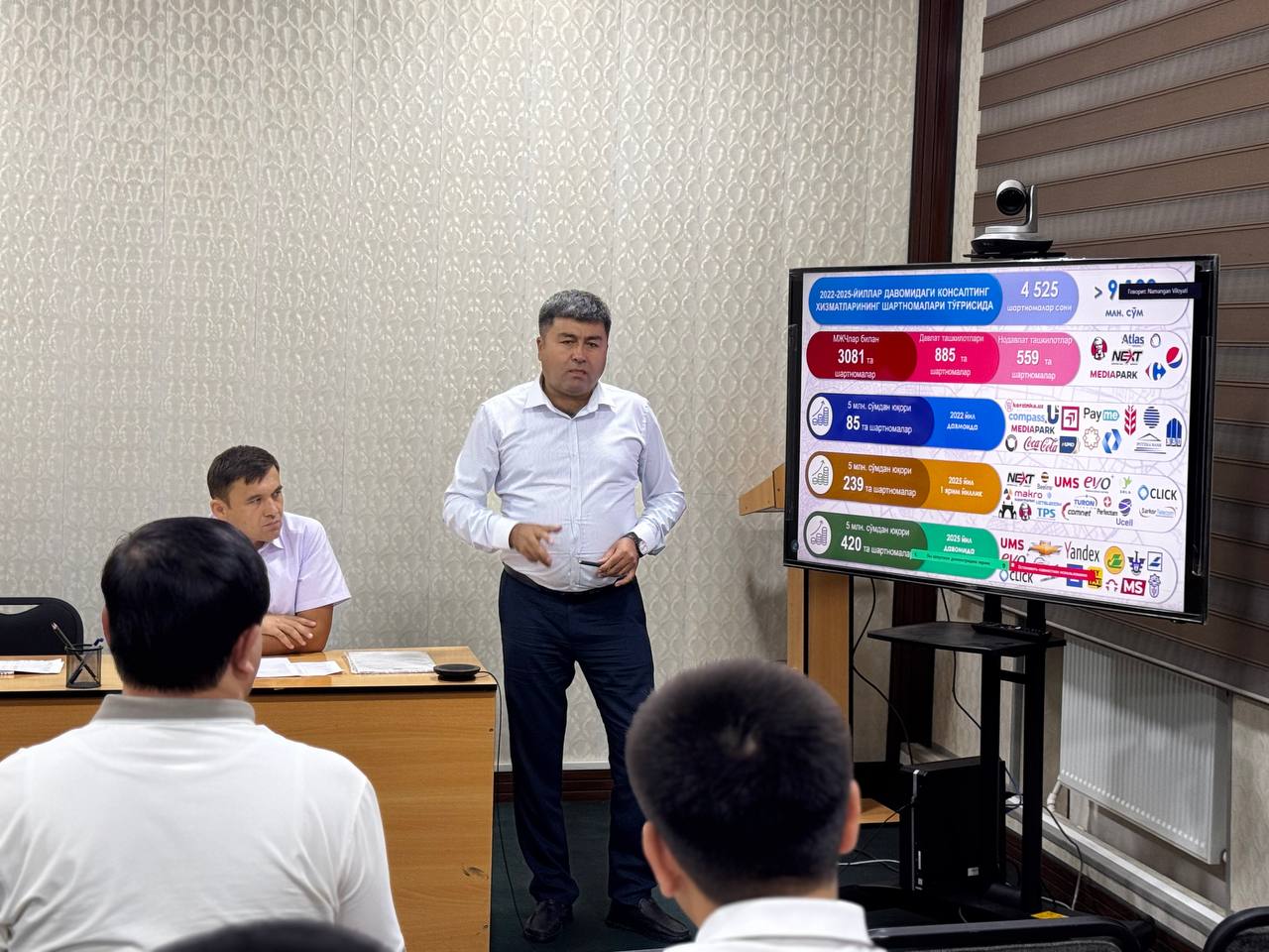 Shuningdek, 2025-yilning ikkinchi yarmida konsalting xizmatini amaliyotga to‘liq joriy etish bo‘yicha ustuvor vazifalar belgilab olindi. Tadbir yakunida ishtirokchilar o‘z fikr-mulohazalarini bildirib, xizmatning ahamiyatini yuqori baholadilar hamda uni tadbirkorlar bilan ishlashda samarali vosita sifatida qo‘llash bo‘yicha takliflarini bildirdilar.