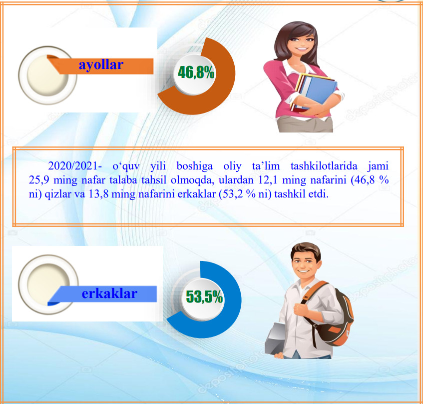 Ma'lumot o'rnida, 2020/2021- o‘quv yili boshiga Namangan viloyati bo‘yicha oliy ta’lim tashkilotlarida 25989 nafar talaba ta’lim olayotgan bo‘lib, ulardan 3216 nafari 21 yoshni, 2681 nafari 20 yoshni, 3015 nafari 22 yoshni, 2487 nafari 23 yoshni tashkil etmoqda.
