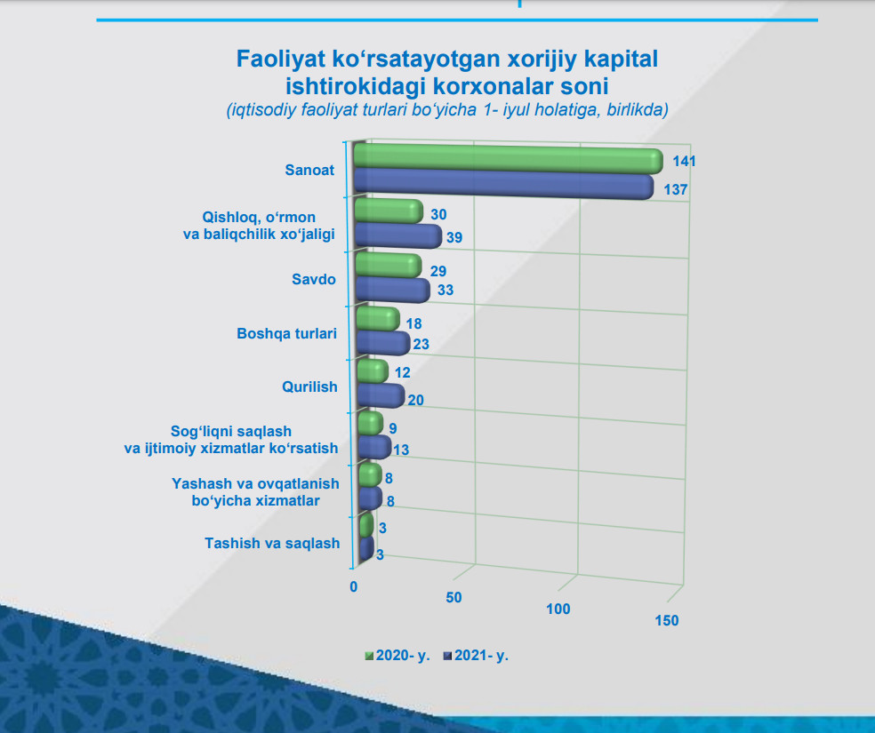 Ro‘yxatdan o‘tgan xorijiy kapital ishtirokidagi korxona va tashkilotlar soni 2021- yil 1- iyul holatiga ko‘ra 285 tani tashkil etib, ulardan 276 tasi yoki 96,8 % faoliyat ko‘rsatmoqda. Bu ko‘rsatkich o‘tgan yilning shu davriga nisbatan olganda 27 taga yoki 1,1 martaga oshganligini ko‘rish mumkin.