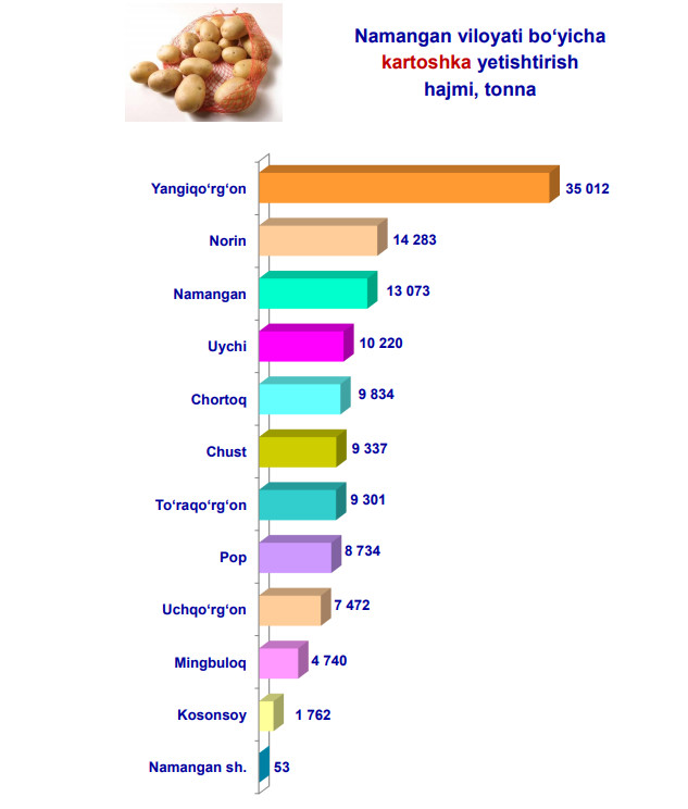 Ma'lumot o‘rnida, kartoshka ishlab chiqarish ko‘rsatkichlarini xo‘jaliklar toifalari bo‘yicha tahlil qilinganda, kartoshka ishlab chiqarish umumiy hajmidan 85,1 % i dehqon (shaxsiy yordamchi) xo‘jaliklari hissasiga to‘g‘ri kelishini ko‘rsatmoqda.