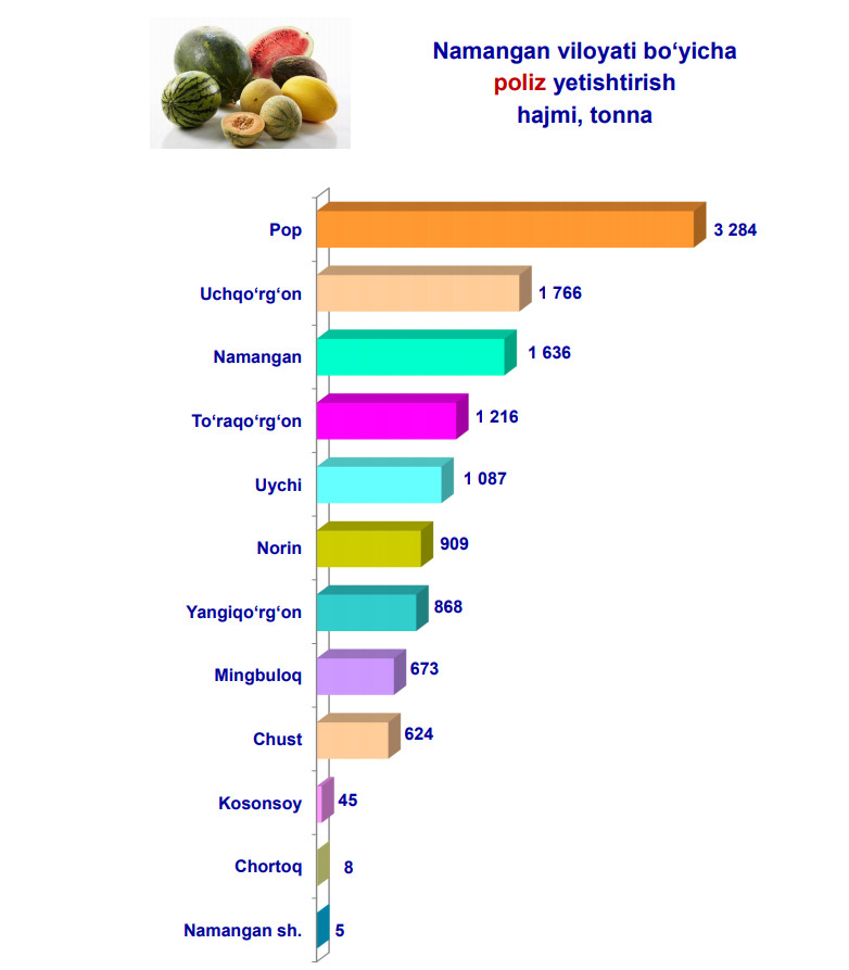 Ma'lumot o‘rnida, poliz ishlab chiqarish ko‘rsatkichlarini xo‘jaliklar toifalari bo‘yicha tahlil qilinganda, poliz mahsultolari umumiy hajmidan 60,7 % i dehqon (shaxsiy yordamchi) xo‘jaliklari hissasiga to‘g‘ri kelishini ko‘rsatmoqda.