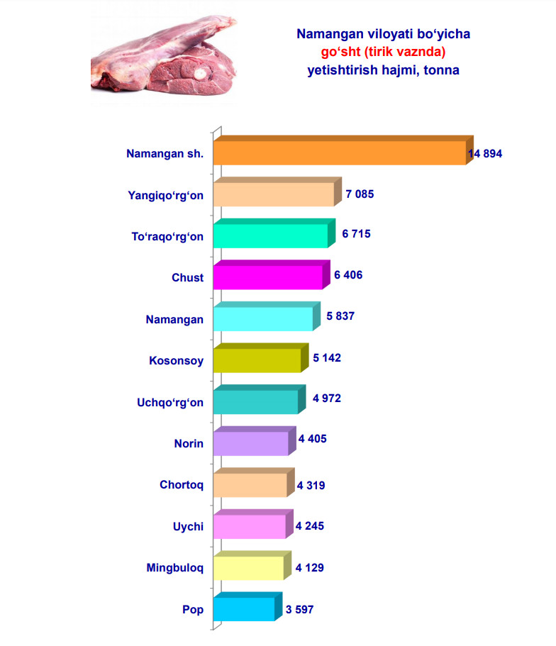 Namangan viloyati bo‘yicha 2021– yilning yanvar– iyun oylarida barcha toifadagi xo‘jaliklar tomonidan tirik vaznda 71,7 ming t. go‘sht ishlab chiqarildi. Bu ko‘rsatkich 2020– yilning yanvar – iyun oylariga nisbatan 5,4 % ga ko‘paygan.