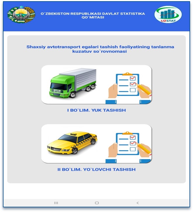 Kuzatuv o‘tkazish jarayonlar Davlat statistika qo’mitasi tomonidan 2020- yil 29- iyunda tasdiqlangan yo’l xaritaning 2.2 bandiga muvofiq shahar va tuman statistika bo’limlariga biriktirilgan planshetlar asosida elekron o’tkazildi.
