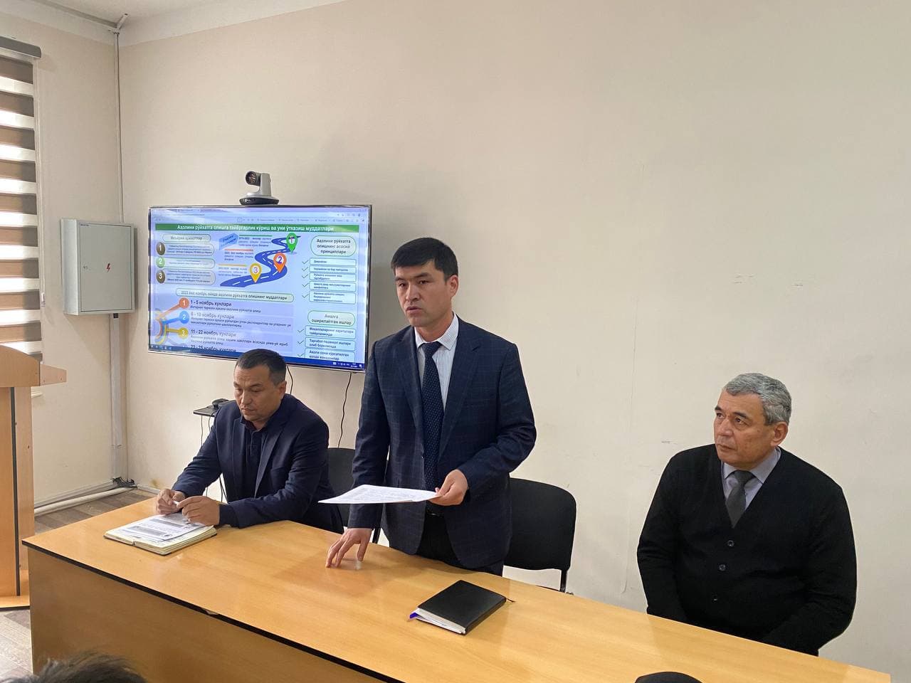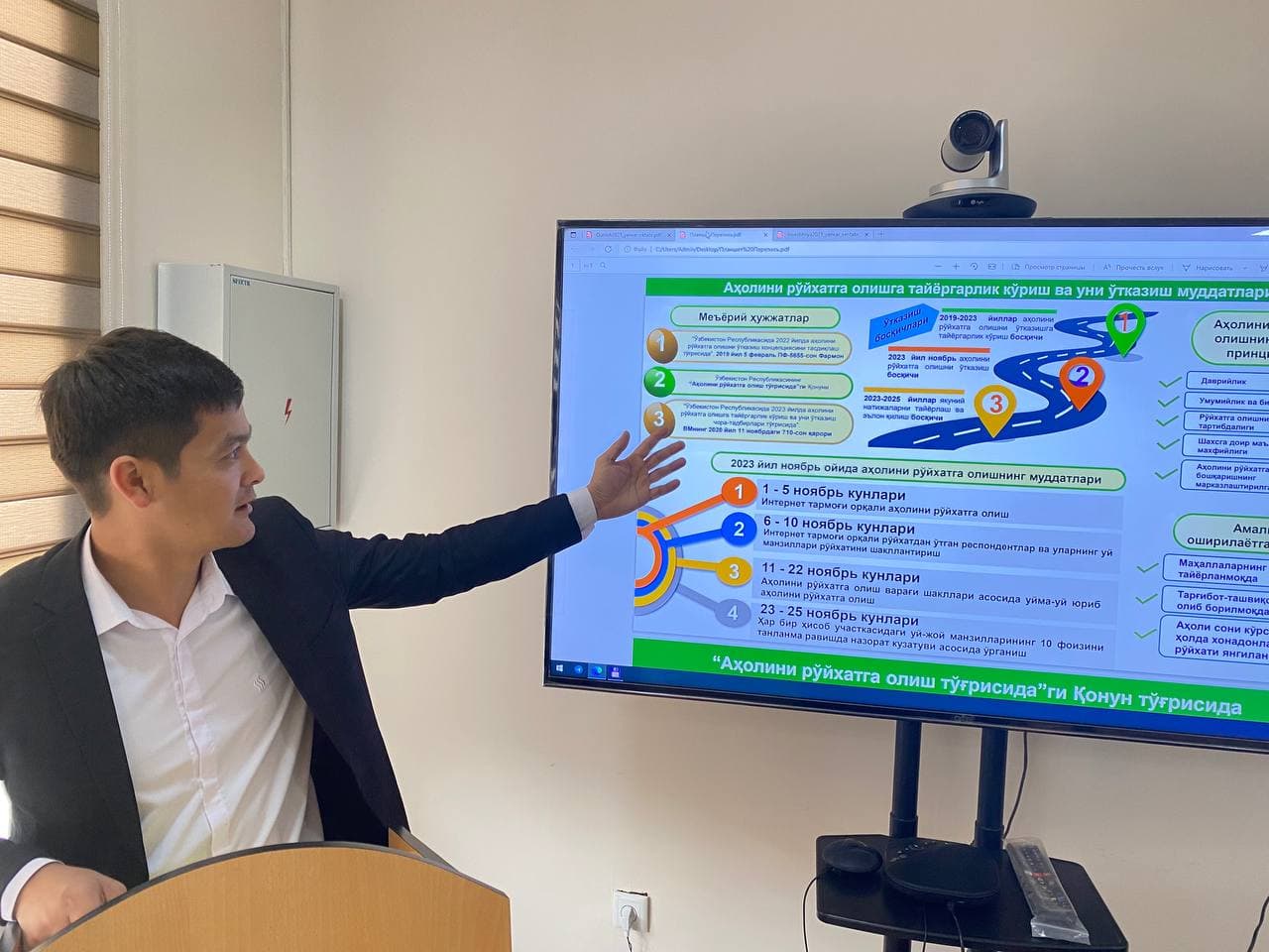 Shuningdek, Ro‘yxatga olish jarayonlarini tashkil etish bo‘limi boshlig‘i N. Najmiddinov O‘zbekiston Respublikasi Vazirlar Mahkamasining 2020- yil 11- noyabrdagi "O‘zbekiston Respublikasida 2023- yilda aholini ro‘yxatga olishga tayyorgarlik ko‘rish va uni o‘tkazish chora-tadbirlari to‘g‘risida"gi 710-son Qarorining mazmun mohiyati to‘g‘risida tushuntirishlar berib, aholini ro‘yxatga olishning maqsadi, ro‘yxatga olishning nima uchun zarurligi hamda qarorda aholini ro‘yxatga olish savolnomalari tasdiqlanganligi tog‘risida tushuntirishlar berib o‘tdi.