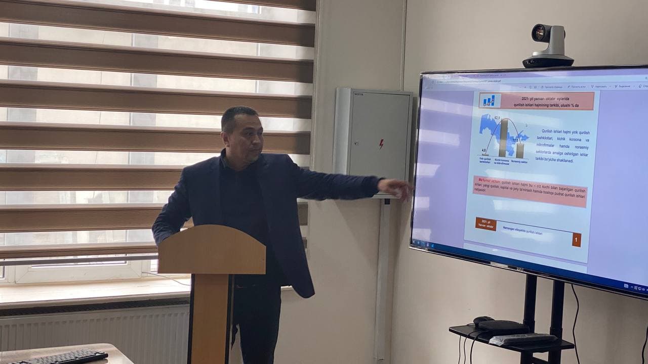 Tadbir davomida qurilish statistikasi bo‘limi boshlig‘i B. Tursinov kichik biznes subyektlari va jismoniy shaxslar tomonidan bajarilgan qurilish ishlari hajmini aniqlash bo‘yicha o‘tkazilgan tanlanma kuzatuvlar natijalari asosida oylik baholash ishlarini amalga oshirish masalalari yuzasidan to‘xtalib o‘tdi.