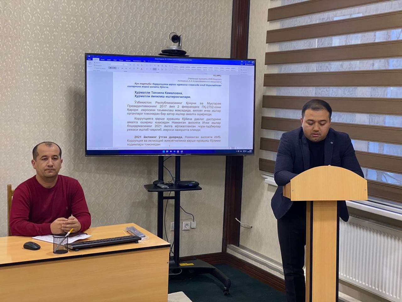 Seminarni Namangan viloyat statistika boshqarmasi boshligʼi S. Melixujayev kirish soʼzi bilan ochib, unda “Korrupsiya-rivojlanishimizga to‘siq” mavzusida maʼruza qilish uchun soʼzni Namangan viloyat IIB Tergov boshqarma katta tergovchisi mayor I. Xo‘janovga berdi.