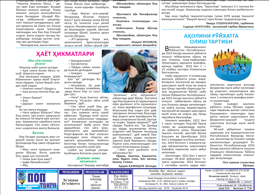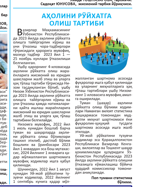 ?"Pop tongi" gazetasining 2022- yilning 20- may kungi 13- sonida Pop tuman statistika bo‘limi tomonidan Aholini ro‘yxatga olish tartiblari nomli maqola chop etildi.