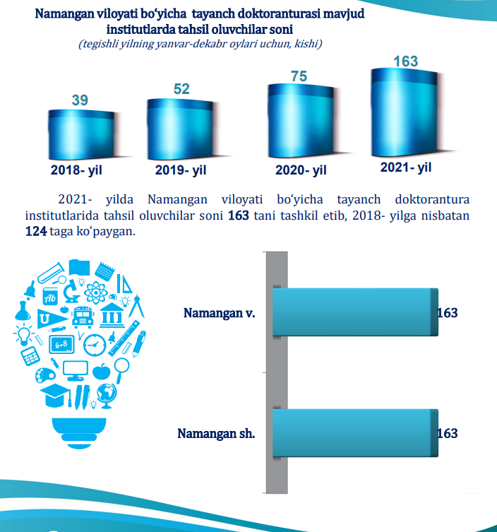 2021- yilda Namangan viloyati bo‘yicha tayanch doktorantura institutlarida tahsil oluvchilar soni 163 tani tashkil etib, 2018- yilga nisbatan 124 taga ko‘paygan.