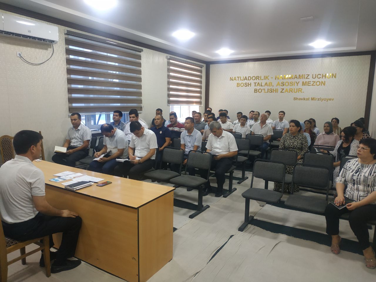 O‘quv mashg‘ulotida boshqarma bosh yuriskonsulti B.Ismatullayev O’zbekiston Respublikasi 16.06.2022-yildagi “O‘zbekiston Respublikasining ayrim qonun hujjatlariga o‘zgartish va qo‘shimchalar kiritish to‘g‘risida”gi O’RQ-779-son va O’zbekiston Respublikasining 29.06.2022 yildagi “Yer uchastkalarini kompensatsiya evaziga jamoat ehtiyojlari uchun olib qo‘yish tartib-taomillari to‘g‘risida”gi O‘RQ–781-son Qonunining mazmun-mohiyatini xodimlarga tushuntirib berdi.