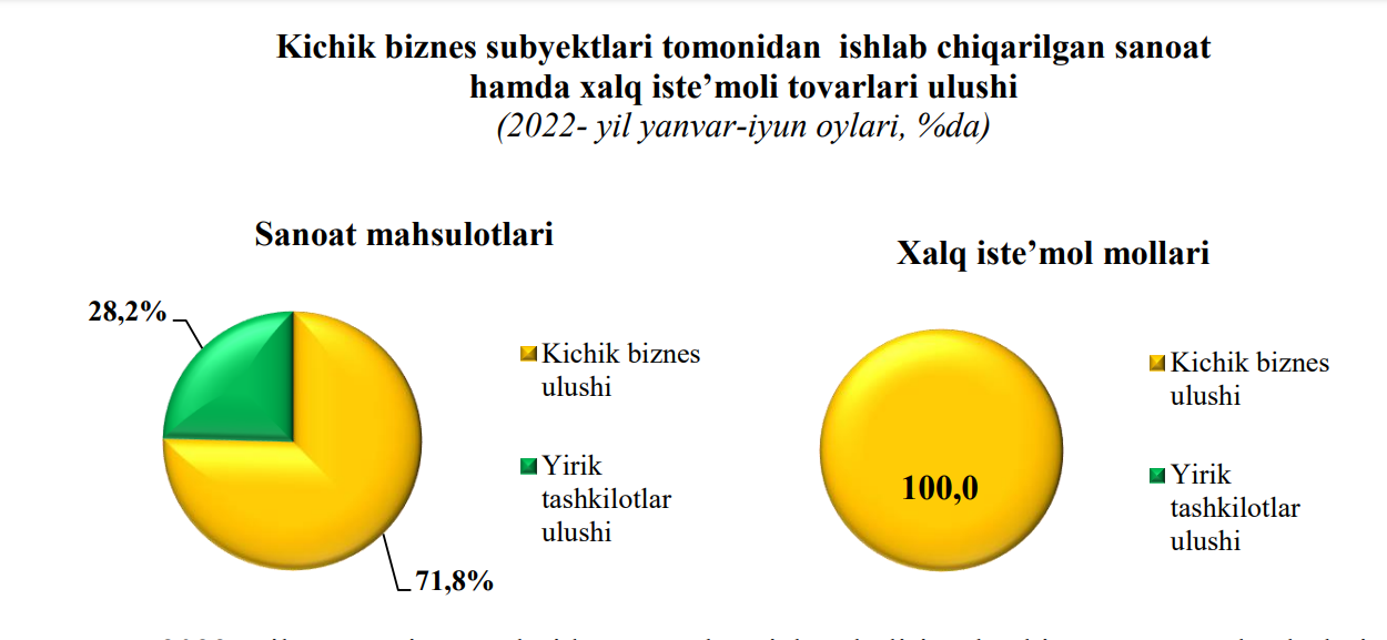 2022- yilning yanvar-iyun oylarida kichik biznes subyektlari tomonidan ishlab chiqarilgan sanoat maxsulotlari hajmi 332,6 mlrd. so‘m bo‘lib, uning jami sanoat ishlab chiqarishidagi ulushi 71,8 % ni tashkil etgan. Shuningdek, ushbu davrda kichik biznes subyektlari tomonidan 149,0 mlrd. so‘mlik xalq iste’mol tovarlari ishlab chiqarilgan bo‘lib, kichik biznes subyektlarining xalq iste’mol tovarlarini ishlab chiqarishdagi ulushi 100,0 % ni tashkil etgan.