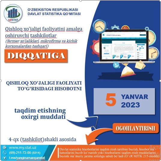 O‘z navbatida hisobot taqdim etish tartibini buzgan mansabdor shaxslarga nisbatan maʼmuriy chora ko‘rilishiga sabab bo‘lishini eslatib o‘tamiz. Davlat statistika tizimiga doir barcha maʼlumotlarni O‘zbekiston Respublikasi Davlat Statitstika Qo‘mitasining www.stat.uz rasmiy saytidan olishingiz mumkin.
