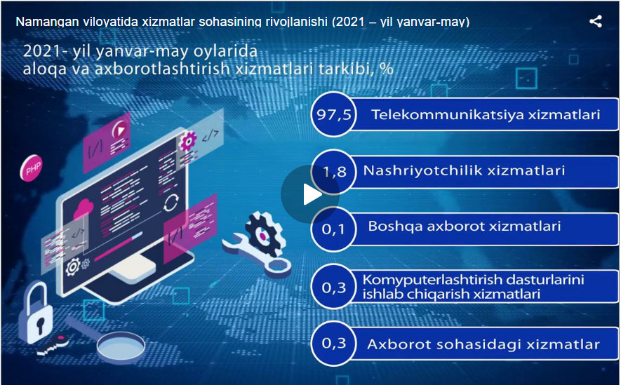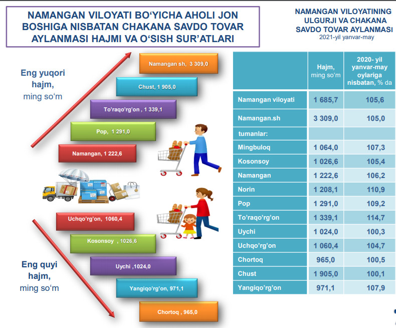 2021- yilning yanvar-dekabr holatiga ko‘ra, Namangan viloyati aholisining umumiy daromadlari hajmining o‘sishi asosan umumiy daromadlar tarkibida 62,4 % ulushga ega bo‘lgan mehnat faoliyatidan olingan daromadlar va 30,3 % ni tashkil etuvchi transfertlardan olingan daromadlarning sezilarli o‘zgarishi hisobiga yuzaga kelgan.