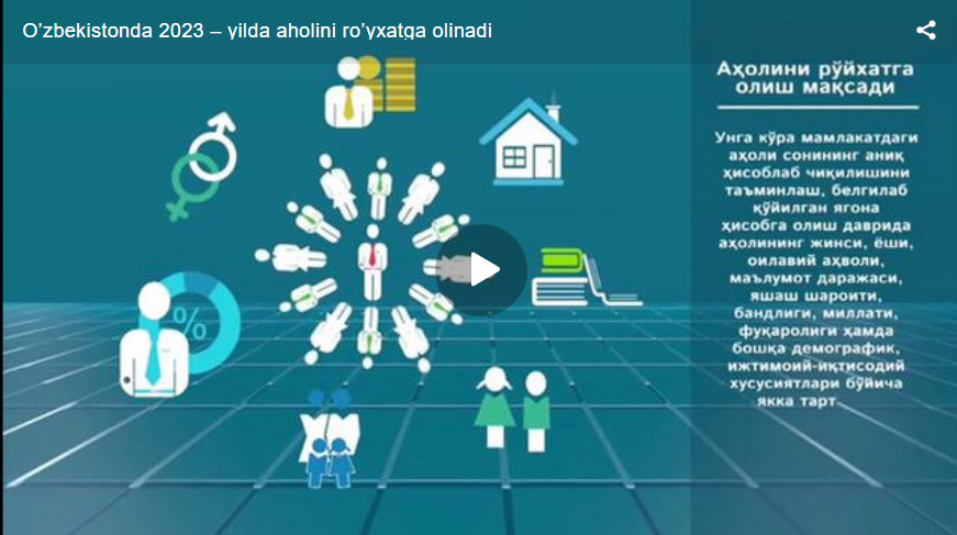 Ma'lumki O‘zbekiston Respublikasida 2023- yilda aholini ro‘yxatga olish tadbiri o‘tkaziladi. Ushbu tadbirni o‘tkazishdan asosiy maqsad — Oʼzbekiston Respublikasida aholi tarkibining holati va rivojlanish dinamikasi haqida mamlakatni sotsial-iqtisodiy va ijtimoiy-siyosiy rivojlantirish sohasidagi davlat siyosatining ustuvor yoʼnalishlarini belgilash va uni amalga oshirish uchun zarur boʼlgan ishonchli va xolis axborotni olishdan iboratdir.