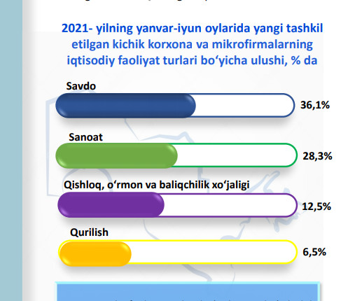 2021- yilning yanvar-dekabr oylarida 6469 ta yangi kichik korxona va mikrofirmalar (fermer va dehqon xo‘jaliklarisiz) tashkil qilindi, bu o‘tgan yilning shu davriga nisbatan 4,3 foizga ko‘p demakdir.